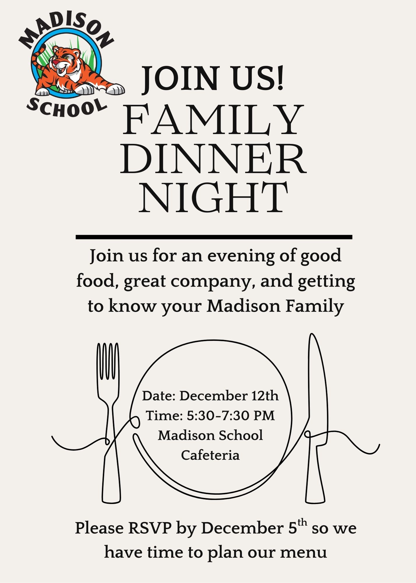 [Thursday, Dec 4 at 3:32 PM]Just a reminder that if you family is wanting to attend our Family Dinner on December 12th that we will need RSVPs no later than Friday December 5th.